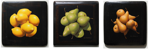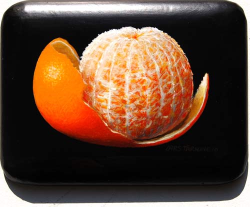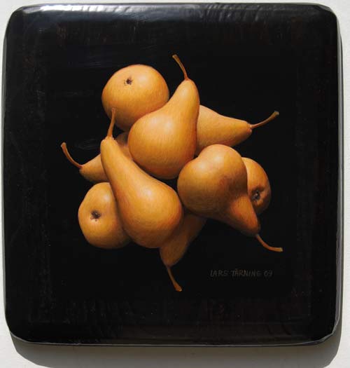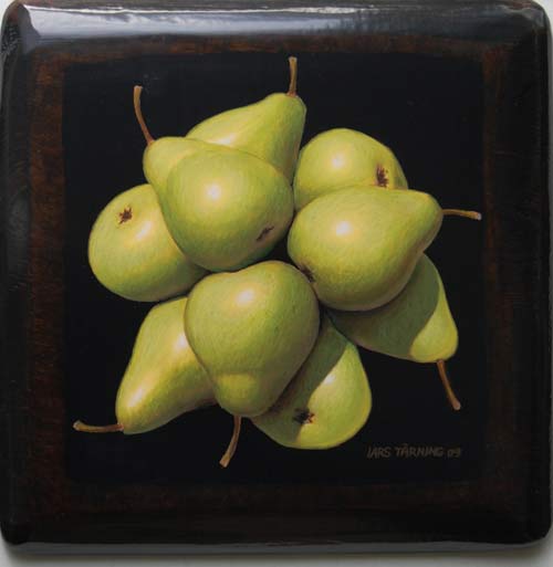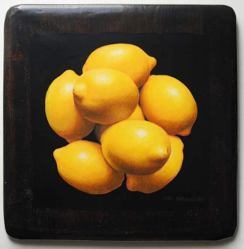 "Lars Tärning målar stilleben, apelsiner och äpplen etc, så tydliga, perfekt illusionistiska, att man tycker sig kunna sätta tänderna i dem. En form av fotorealism om man så vill, och det är inte att förakta. Tekniken är fulländad i lackade ytor, som får målningarna att glänsa och ge ifrån sig de vällustigaste reflexer. Ser man noga efter är han också en subtil bildbyggare, som ordnar sina frukter i diskreta förskjutningar- skapar på så sätt ytor av volym och rörelse. Det är inte svårt att se frukterna som geometriska objekt. Abstraktioner i all ära, bara man får ha kvar känslan av den goda smakern i munnen!"
